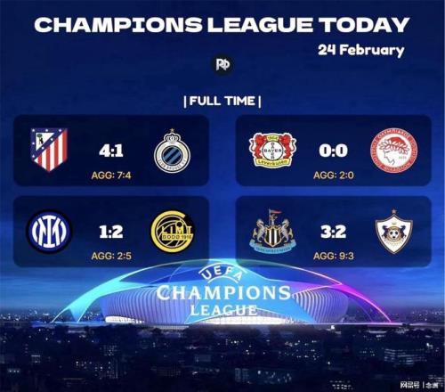 北京时间2月25日,昨夜今晨,足坛又有新的重大事件发生,欧冠淘汰赛附加赛进行,国米遭双杀出局,纽卡、马竞和勒沃库森晋级。