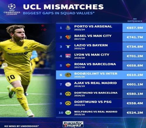 这场失利,也是欧冠历史上极具代表性的以弱胜强,位列欧冠历史以弱胜强第六大身价差。面对实力、名气、财力都远胜自己的对手,博德闪耀用两场稳健而高效的表现赢得尊重。