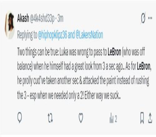 湖蜜:东契奇拒投绝杀传给给勒布朗就是错,他明明有一个绝佳的空位三分机会而勒布朗明显已经失去平衡。但是詹姆斯也有错,他接球后甚至还能有超过一秒钟的突破内线时间,我们只需要一个两分球就可以赢得比赛不需要去强投三分。