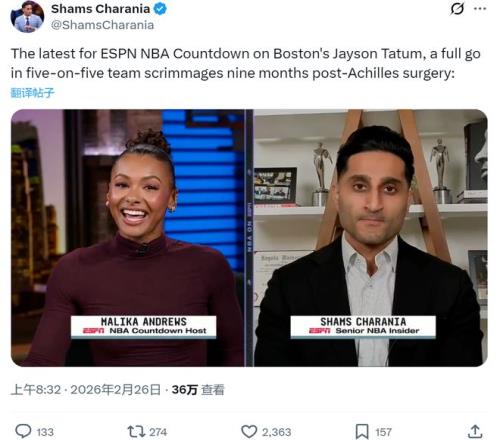 2025年5月12日,东部半决赛G4,塔图姆遭遇右脚跟腱撕裂。一年不到,满血复活。前队友斯玛特直接看傻了:“这太不可思议了,某种意义上来说有些疯狂。没想到体育医学领域已经取得了如此巨大的进步。”