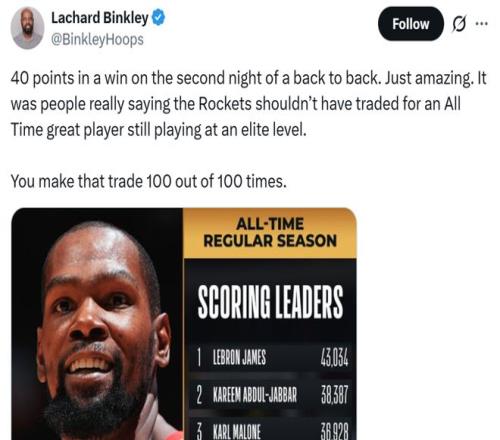 面对杜兰特这样的表现,队记Lachard Binkley不禁感叹道:“竟然有人认为火箭队不应该交易得到这位仍然处于巅峰状态的历史级球员,这种交易就算重来100次你都一定会做。”