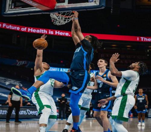 摩西-布朗,身高2米18的大中锋,2019年的NBA落选秀,在开拓者、雷霆、快船等多支球队效力过。布朗20-21赛季在雷霆队场均出战21分钟,可以得到8.6分8.9篮板1.1盖帽,数据还可以,其中在对阵凯尔特人的比赛中拿到21分23篮板的大号两双。上赛季在独行侠队打了4场比赛,场均可以得到11.8分7.8篮板。休赛期和掘金队签下了一份训练营合同,但随后掘金队裁掉了布朗。布朗大部分时间在NBA发展联盟打球,在发展联盟单场轰下过27分26篮板4盖帽的恐怖数据。