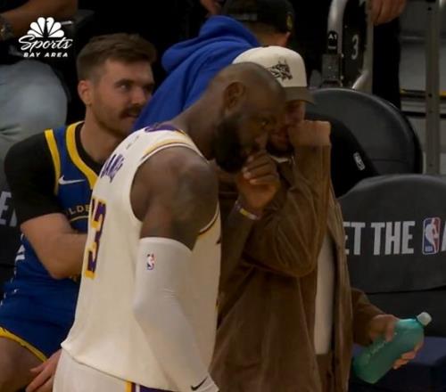 下半场开局詹姆斯与场边的库里交流。