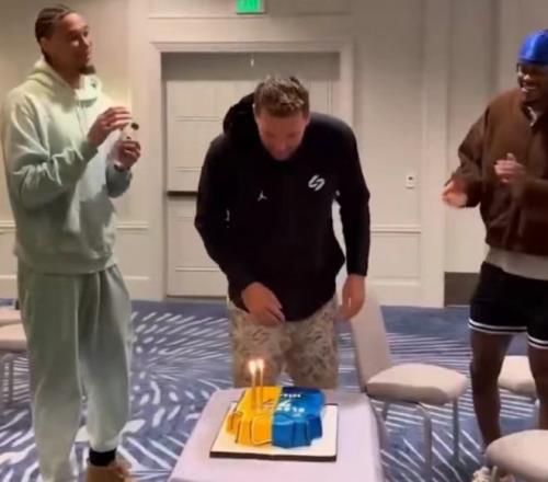湖人赛前给东契奇庆祝27岁生日,追梦拥抱东契奇贺寿。