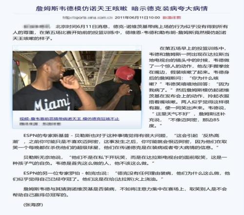在G4赛后,小牛主教练里克-卡莱尔在面对采访的时候,无意中说到诺维斯基高烧39度,但仍然坚持打完比赛并且在比赛最后关头投进关键球。作为球迷,听到这番话,只能够感受到职业球员为争取荣誉,突破自身极限的竞技体育精神,但是在韦德和詹姆斯那里,这却成为了嘲讽诺维斯基的理由。