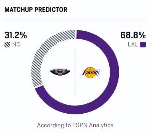 反观湖人近期拿下两连胜,暂列西部第六。上场比赛,他们24分大胜国王,詹姆斯状态出色,砍下24分5助攻,东契奇三节打卡下班,砍下28分5篮板9助攻!值得一说的是,在全明星赛后,东契奇场均拿到30分,詹姆斯场均19.2分,里夫斯场均17.7分,三巨头渐入佳境,且同时在场的净效率值也由负转正!赛前,ESPN预测本场比赛的结果:湖人胜率68.8%,鹈鹕胜率只有31.2%!