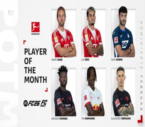 北京时间3月4日,德甲官方公布了德甲2月最佳球员候选,其中凯恩、迪亚斯领衔,扬-迪奥曼德、卡巴克、塔普索巴、格里马尔多在列。