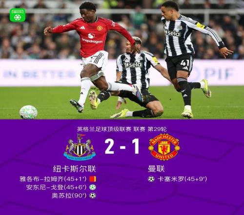 北京时间3月5日英格兰足球顶级联赛 联赛 第29轮,纽卡斯尔联主场对阵曼联。纽卡斯尔联安东尼-戈登破门,奥苏拉破门。曼联卡塞米罗破门。最终比分纽卡斯尔联 2-1 曼联。