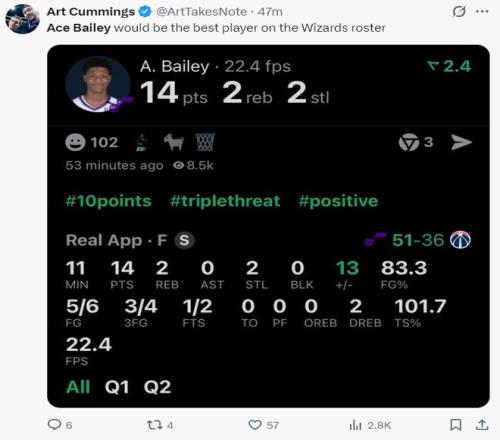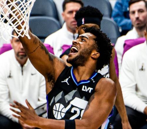 上半场贝利已经有多次炸框的表现,而且身体天赋尽显,各种空中拉杆、滞空暴扣,虽然爵士本赛季的战绩不佳,但贝利进入最佳新秀一阵没有啥大问题。