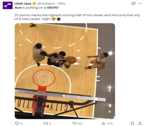 贝利第三节就已经创造职业生涯新高了,他此前单场最高分是25分,这场三节28分钟,18中11,三分10中6已经拿到29分。末节一开场贝利并没有立马被换回,因为这时候爵士还领先奇才9分之多。没想到表现如此出色的贝利也没有得到更多登场时间 ,他在末节还剩5分钟不到才回来,但他回来就命中三分。