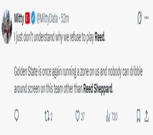 火箭记者Mitty:我就是不明白为什么球队拒绝让谢泼德先发,勇士对我们的紧逼防守除了谢泼德外根本没人可以突破他们的防线,他是我们需要的控球手。