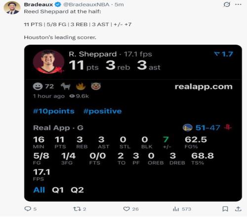 上半场打完谢泼德16分钟,8中5,三分4中1,拿到11分3篮板3助攻,他在场是+7,但上半场打完火箭是落后勇士的。
