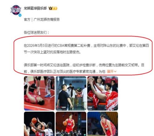 后来,广州队也是在第一时间公布了郭艾伦的伤情,广州队公告内容表示:郭艾伦伤病位置为左膝前交叉韧带断了,接下来,球队会请专家制定康复方案,给郭艾伦一个最好的康复治疗。
