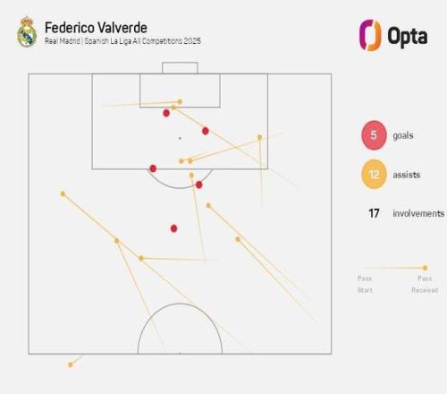 至此,巴尔韦德本赛季代表皇家马德里在各项赛事已直接参与17球(5球12助),追平皇马生涯单赛季第二多参与进球纪录(2024-25赛季也是17球),仅次于2022-23赛季的19球。