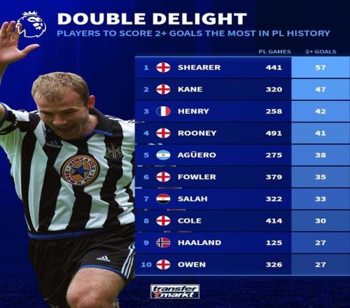 北京时间3月6日,德转统计出了英超历史单场进球2+场次最多的10名球员,阿兰-希勒57场排名第1,哈里-凯恩47场第2,亨利42场第3。