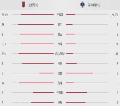 本场比赛,多打1人的成都蓉城可以说是完全掌控比赛,拿到78.4%的控球率,创造了14个角球,28脚射门,其中8脚射正斩获5球。