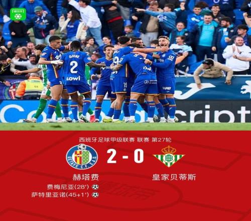 北京时间3月8日西班牙足球甲级联赛 联赛 第27轮,赫塔费主场对阵皇家贝蒂斯。赫塔费费梅尼亚破门,萨特里亚诺破门。最终比分赫塔费 2-0 皇家贝蒂斯。