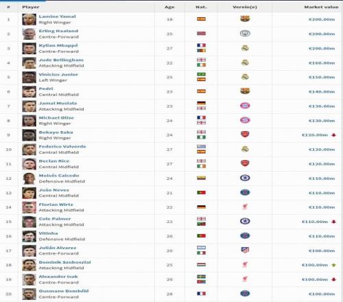 根据统计,到目前为止,世界足坛已经有了20位亿元先生,其中身价最高的是亚马尔、哈兰德和姆巴佩,他们的身价都是2亿欧元。