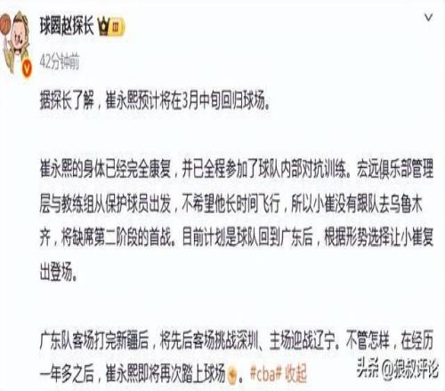 北京时间3月10日,根据媒体人赵探长发文:崔永熙预计将在3月中旬回归球场。