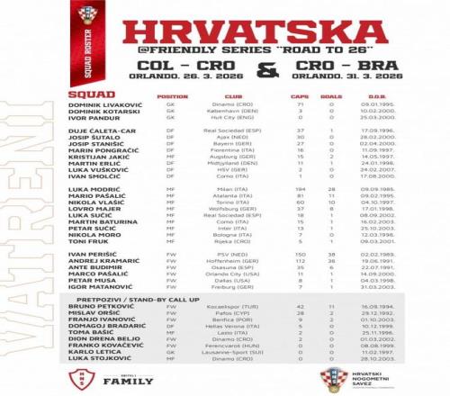 克罗地亚国家队公布了3月份友谊赛的球员名单,他们将在友谊赛中对阵哥伦比亚和巴西。皇马传奇莫德里奇领衔大名单,国际米兰中场苏西奇在列。格瓦迪奥尔和科瓦契奇因伤缺席本次集训机会的。这会是他们世界杯之前的重要训练机会。