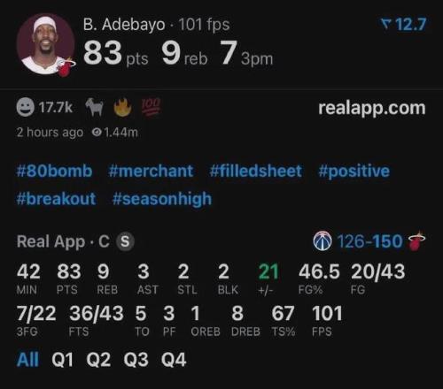 次节阿德巴约得分继续上双,半场结束时已得到43分,打破詹姆斯保持的热火队史半场纪录(37分)。