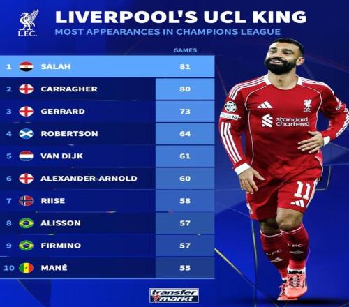 北京时间3月11日,德转统计出了利物浦队史欧冠出场数前10,首发出战了与加拉塔萨雷1/8决赛首回合的萨拉赫也就此以81场超越卡拉格独占红军队史欧冠出场数第1。