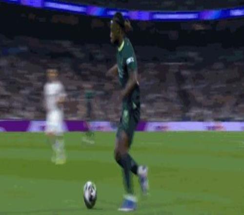 第66分钟,维尼修斯左路内切兜射远角,皮球擦柱而出
