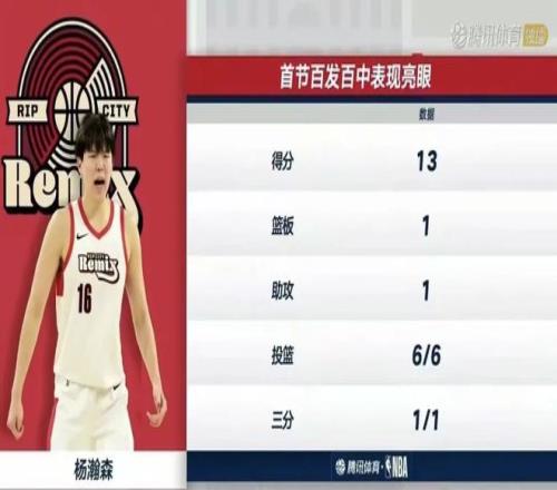 对阵圣地亚哥快船队的这场比赛,杨瀚森全场比赛16投14中,其中前13次出手全部命中。第1节比赛杨瀚森6投6中,包括1记三分球,拿到13分1篮板1助攻的数据;前三节比赛结束杨瀚森出场24分钟,投篮12中12,拿到27分3篮板3助攻1抢断的数据,堪比当年在火箭队巅峰期的姚明。
