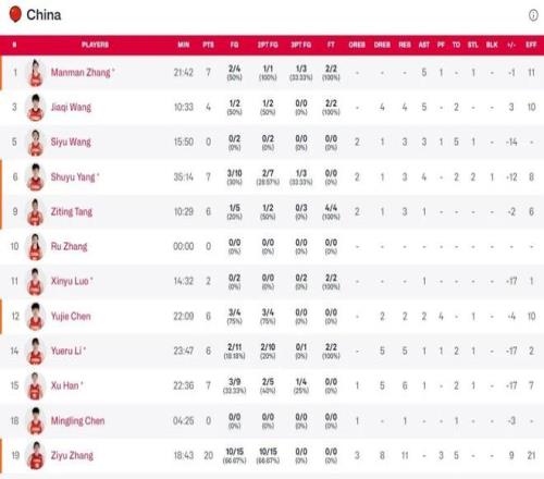 统计数据显示:张子宇在场期间,中国队净胜9分;而她下场的21分钟里,球队净负24分。这一悬殊对比,直观印证了她在攻防体系中的不可替代性。