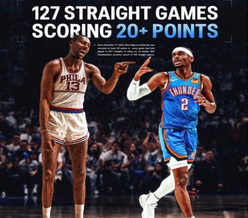 全场数据,雷霆这边,亚历山大18中13,罚球8中7砍下35分6篮板9助攻2抢断3盖帽4失误,连续127场20+ ,超越上古神兽张伯伦独享历史第一;切特-霍姆格伦10中5得到12分8篮板;多尔特低迷8中2仅得6分6篮板。