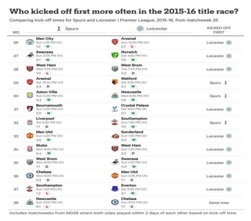 “他们似乎每个周末都比我们先赛,当他们赢了的时候,那感觉就像一记重拳。如果是一个绝杀球,或者是在第90分钟连进两球,那就会产生影响,”当时的热刺球员埃里克-戴尔在接受加里-内维尔采访时告诉The Overlap。哈里-凯恩也赞同这一观点。“我们似乎总是最后比赛的球队,”他在4月中旬一个周一晚上热刺客场4-0战胜斯托克城后说道,而莱斯特城在前一天下午刚刚对阵了西汉姆联。