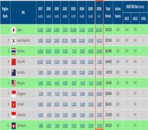 近日,2025/26赛季亚冠精英联赛东亚区四强(町田泽维亚、神户胜利船、柔佛新山、武里南联)、亚冠二级联赛东亚区双雄(大阪钢巴、曼谷联)、亚洲挑战者联赛东亚区双雄(马尼拉挖掘者、柴桢)全部决出。随着柬埔寨球队柴桢闯入亚挑联半决赛,本赛季中超亚冠技术积分已经被柬埔寨超越。