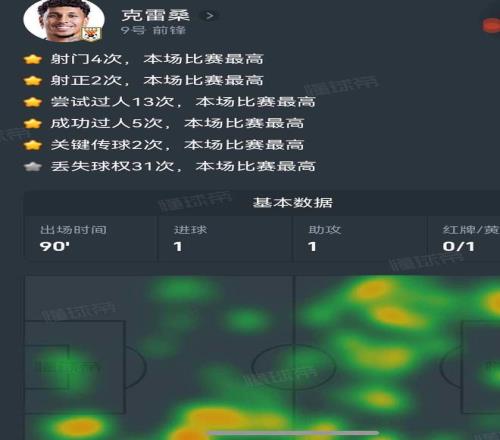 而泽卡看起来并没有给对手的球门造成太大的威胁。但12次争顶,7次成功拿下第一点都是全场最多。当阿尔瓦罗找泽卡,这条“运输线”得到保障,也就给了克雷桑爆发的机会。虽然他是全场丢失球权最多的球员,但他同样是全场过人次数、关键传球次数最多的球员。特别是在下半场比赛,克雷桑在场上的发挥,完全是独一档的存在。