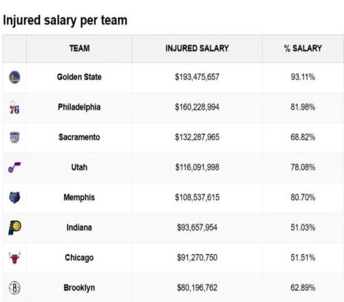 一项冷冰冰的统计, 勇士目前的伤员薪水已经达到了1.93亿美元,占全队工资的93.11%,两个数字都是高居联盟第一;
