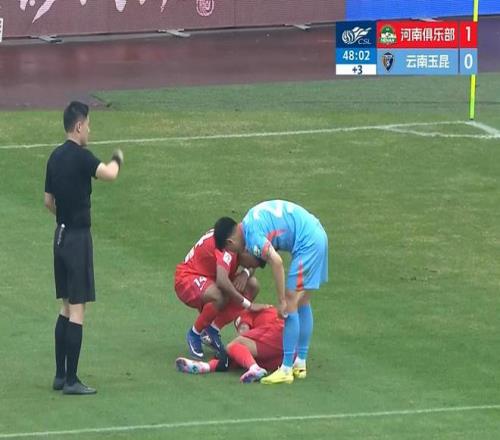 第49分钟,古斯塔沃妙传姆布拉,姆布拉单刀情况下与鲍亚雄身体接触后在对方禁区摔倒,姆布拉表达抗议,但主裁判沈寅豪并未理睬。对方旋即反击中将球打进,河南队长王上源等多名球员提出质疑,奈何VAR只给出云南此次反击是否越位的镜头,对此前姆布拉在对方禁区倒地并未给出清晰镜头和解释,姆布拉是否被犯规成了疑云。