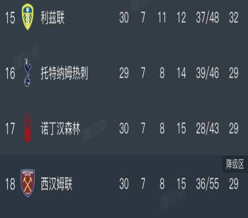 至此,西汉姆联和森林的积分都来到了29分,这意味着上述两支球队的积分已经追平了热刺,不过热刺暂时仍以净胜球的优势排名第16。