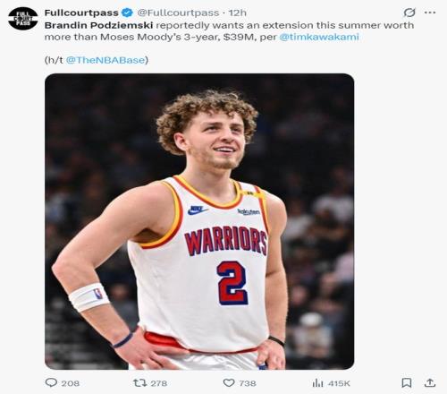 赛前根据勇士记者蒂姆川上的报道,波杰姆斯基预计在今夏寻求一份三年超过3900万的续约合同,他想要的比穆迪三年3900万要多得多,勇士方面已经表达不可能给他像普尔那样4年1.23亿的巨额合同,所以他索要的合同是三年4000万以上。