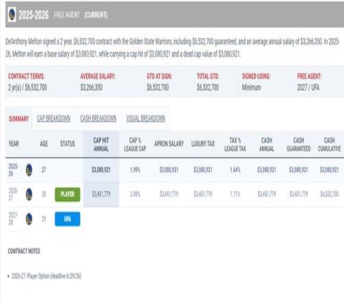 28岁的梅尔顿去年夏天与勇士签下的合同是两年653万,本赛季300万,下赛季345万,他的性价比完爆波杰。