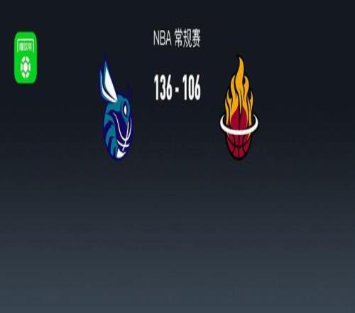第四节黄蜂布兰登-米勒拿下8分,热火诺曼-鲍威尔拿下5分,最终黄蜂136-106战胜热火