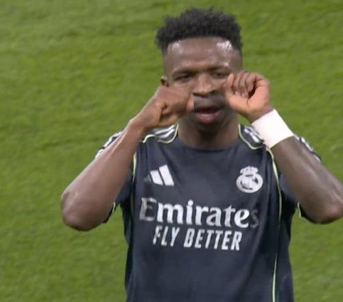 进球后的维尼修斯开启了“全员恶人”模式。他先是用犀利的眼神挑衅全场球迷,然后优哉游哉地坐在广告牌上,等着队友们跑过来庆祝这个关键进球。