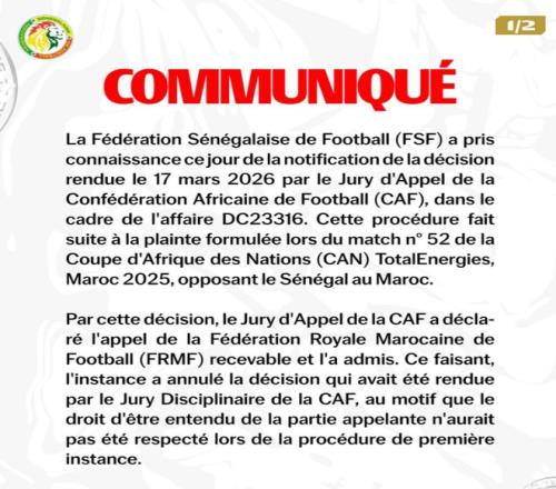 非洲足联官方发布声明,塞内加尔国家队被判在非洲杯决赛中弃权,本场决赛按0-3摩洛哥获胜。