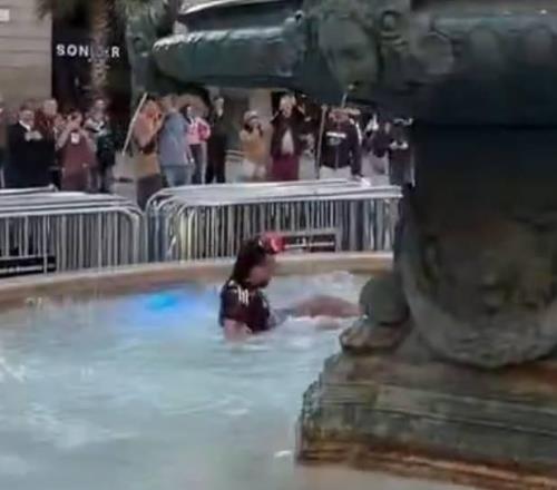 随后镜头一转,一名亢奋的球迷跳入了喷泉池,又有几名球迷在街头将足球大脚开上天空,这可能也解释了为什么视频的开头足球会卡在树上。此外,还有球迷挂起助威横幅,甚至还写道“你们有在巴塞罗那见过桑德兰人吗”,嘲讽起了同城死敌桑德兰。