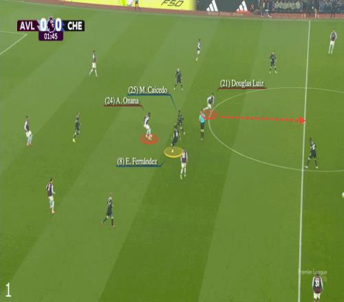 例如,费尔南德斯传球失误,然后慢了一步未能封堵阿马杜-奥纳纳,导致凯塞多过来协防。这留下了道格拉斯-路易斯在切尔西中场线后处于空位,虽然费尔南德斯设法回到了防守中,但他错过了两次拦截球的好机会,也跟丢了巴西人的前插,后者灵巧地接应利昂-贝利的低传破门: