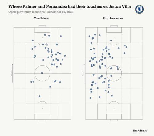 在那场对阵维拉的比赛中,他们各自影响力范围有着自然的平衡,帕尔默主要在球场右侧触球,费尔南德斯在左侧: