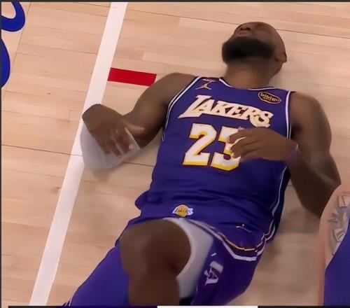 詹姆斯躺在地上缓了好一会儿才起身,表情痛苦。