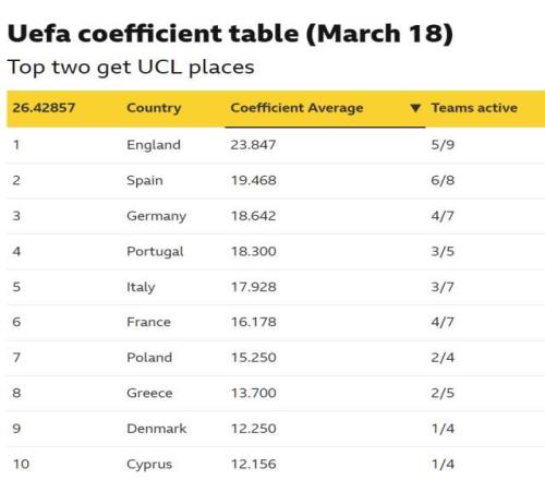 关于这个额外的名额,简而言之就是欧足联颁给“单季表现最好两家联赛”的奖励。而如何定义“最佳”,靠的就是欧足联系数(俗称欧战积分)。在2024-25赛季,英超拿到了29.464的高分,位居各大联赛之首,西甲23.892分排名第二。两家联赛也因此获得了联赛第五也能踢本赛季欧冠的优待。