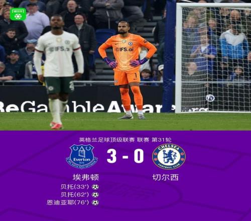 北京时间3月22日英格兰足球顶级联赛第31轮,埃弗顿主场对阵切尔西。上半场,加纳直塞,贝托挑射破门。下半场,贝托再次破门,上演梅开二度,随后贝托助攻,恩迪亚耶兜射死角,锁定胜局。最终比分埃弗顿 3-0 切尔西。