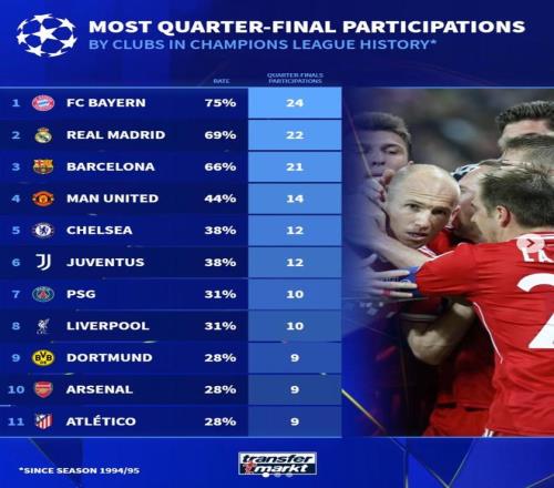 北京时间3月20日,在本赛季欧冠8强全部出炉之后,德转统计出了1994-95赛季至晋级欧冠8强次数最多的11家俱乐部,拜仁慕尼黑以24次高居第一,皇家马德里22次第二,巴塞罗那21次第三。