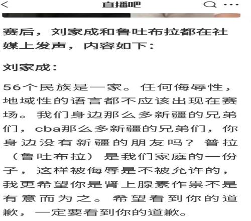 下面再来看看两位当事人是怎么说的,赛后刘总和鲁吐布拉都在个人社媒上发文怒斥李祥波,刘总表示:56个民族是一家。任何侮辱性,地域性的语言都不应该出现在赛场。