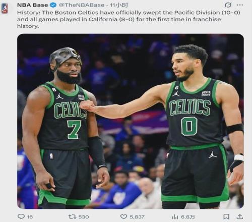 凯尔特人本赛季面对太平洋赛区的球队,豪取10胜0负,完成了横扫。这是凯尔特人1946年建队以来,第一次横扫整个太平洋赛区。这个赛区的球队大家很熟悉:勇士、快船、湖人、太阳和国王。除了国王之外,其余球队实力并不弱。